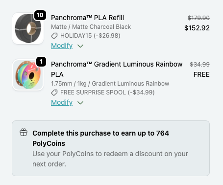 Polymaker does have 20% off on the refill rolls with no minimum requirement, which drops them down to $15.30 per roll. While that’s good for one roll, it loses out to Bambu right now. However, they are offering some other freebies right now, at $25, $50 and a surprise, free roll at $150 spent per order. On top of that, you can earn PolyCoins which can be redeemed for money off future purchases.