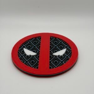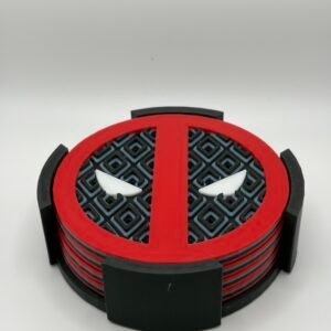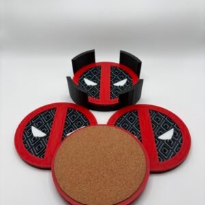 Add some comic book flair to your coffee table or bar with this set of 4 Deadpool-inspired coasters, complete with a matching caddy for storage. Each coaster is 3D printed with bold red, black, grey, and white detailing that captures the unmistakable look of the Merc with a Mouth.